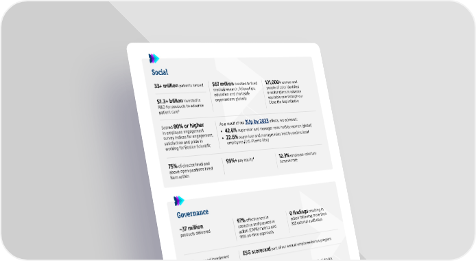 Social 33+ million patients served $67 million donated to fund 121,000+ women and medical research, fellowships, people of color identified education and charitable in action plans to advance $1.3+ billioninvested in organizations globally equitable care through our R&D for products to advance Close the Gap initiative 3 patient care Scored 80% or higher As a result of our 3Up by 2023 efforts, we achieved: in employee engagement • 42.6% supervisor and manager roles held by women (global) survey indices for engagement, satisfaction and pride in • 22.6% supervisor and manager roles held by multicultural working for Boston Scientific employees (U.S./Puerto Rico) 4 75% of director level and 99%+pay equity 12.3% employee voluntary above open positions hired turnover rate from within Governance ~37 million 97% effectiveness in 0 findings resulting in products delivered corrective and preventive action following more than action (CAPA) metrics and 325 external audit days 99% on-time approvals 35% increased investment ESG scorecard part of our annual employee bonus program in cybersecurity Implemented zero-trust Board experience cybersecurity model Board of director member experience includes medical device, focused on user, assets and risk management, technology, quality and financial literacy resources to strengthen our resilience against cyber threats Board independence 30% of board of director A significant majority of our Board of Directors qualify as independent under the New York Stock Exchange’s Corporate members self-identify as Governance Standards, including a lead independent director women, 30% self-identify as ethnically diverse5 Note: All data as of December 31, 2022 unless otherwise specified. 3 Represents GAAP R&D expense per 2022 Annual Report on Form 10-K. 4 Figure from 2021 results. Analysis is completed every other year. 5 Donna James will remain in her role as a director of the Company until her resignation becomes effective on the day of the 2023 Annual Meeting of Stockholders, which is scheduled to occur on May 4, 2023.