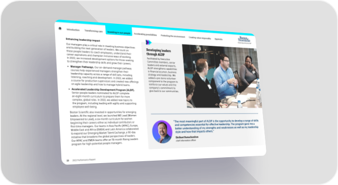 Introduction Transforming care Investing in our people Accelerating possibilities Protecting the environment Creating value responsibly Appendix Enhancing leadership impact Our managers play a critical role in meeting business objectives Developing leaders and building the next generation of leaders. We count on through ALDP these people leaders to coach employees, understand their career aspirations and champion inclusive ways of working. Facilitated by Executive In 2022, we increased development options for those seeking Committee members, senior to strengthen their leadership skills and grow their careers: leaders and external experts, • Manager Pathways. Our on-demand manager pathway ALDP strengthens capabilities courses help experienced managers strengthen their in financial acumen, business leadership capacity across a range of skill sets, including strategy and leadership. We listening, coaching and development. In 2022, we added added a pro bono volunteer a course for production supervisors and created new offerings component to the program to on agile leadership and how to manage hybrid teams. reinforce our values and the company's commitment to • Accelerated Leadership Development Program (ALDP). give back to our communities. Senior people leaders nominated for ALDP complete an eight-month curriculum to prepare them for more complex, global roles. In 2022, we added new topics to the program, including leading with agility and supporting employee well-being. Boston Scientific also invested in opportunities for emerging leaders. At the regional level, we launched WE Lead (Women Empowered to Lead), a six-month curriculum for women beginning their careers either as individual contributors or “ The most meaningful part of ALDP is the opportunity to develop a range of skills first-time managers. Our teams in Asia Pacific (APAC), Europe, and competencies essential for effective leadership. The program gave me a Middle East and Africa (EMEA) and Latin America collaborated better understanding of my strengths and weaknesses as well as my leadership to expand our Emerging Market Talent Exchange, a 90-day style and how that impacts others.” initiative that broadens the global perspectives of leaders. Our APAC and EMEA teams offer an 18-month Rising Leaders Shrikant Ramachandran program for high-potential people managers. chief information officer 23 2022 Performance Report
