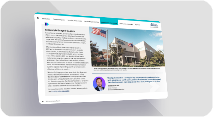 Introduction Transforming care Investing in our people Accelerating possibilities Protecting the environment Creating value responsibly Appendix Resiliency in the eye of the storm Across Boston Scientific, operational and climate resiliency efforts ensure the safety of our global workforce and the reliable delivery of our medical solutions to providers caring for patients. We continually assess potential vulnerabilities and take action wherever necessary to protect our people, facilities and supply chain. After Hurricane Maria devastated the Caribbean in 2017, we implemented critical infrastructure upgrades at our Dorado, Puerto Rico manufacturing site. It was an investment that proved invaluable when Hurricane Fiona hit the island in 2022 and global and local teams implemented proactive measures that kept disruption to a minimum. Days before Fiona made landfall, products were stocked and secured to ensure an uninterrupted supply chain, and we switched to independent water and power systems capable of providing us with up to two months of backup utilities and supplies. As part of our long-term risk management strategy, facility upgrades at our Dorado, Puerto Rico manufacturing site over the last five years included a hurricane roof, hurricane shutters and increased generator capacity. With the facility prepared, we proactively shut down and sent our 800 employees home to ensure their safety. We immediately confirmed that all our people and their families were safe as Fiona left the island, then turned “ We all pulled together, and the plan kept our people and operations protected, our focus to reopening. Our Dorado team rallied to resume while also ensuring our life-saving products made it to the patients who needed operations a day later, a testament to their perseverance them. Our teams were many steps ahead of the storm, looking out for all of us.” and a resiliency plan that left nothing to chance. Ariel Gonzalez Ruiz For more information about our business resiliency efforts, senior manager, see Creating value responsibly. Environmental Health & Safety 45 2022 Performance Report