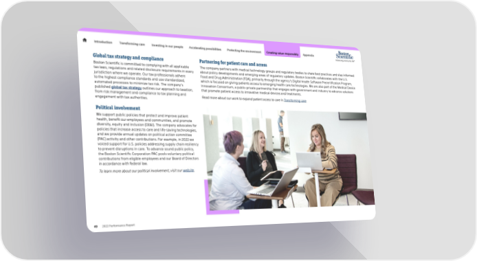 Introduction Transforming care Investing in our people Accelerating possibilities Protecting the environment Creating value responsibly Appendix Global tax strategy and compliance Partnering for patient care and access Boston Scientific is committed to complying with all applicable The company partners with medical technology groups and regulatory bodies to share best practices and stay informed tax laws, regulations and related disclosure requirements in every about policy developments and emerging areas of regulatory updates. Boston Scientific collaborates with the U.S. jurisdiction where we operate. Our tax professionals adhere Food and Drug Administration (FDA), primarily through the agency’s Digital Health Software Precertification Program, to the highest compliance standards and use standardized, which is focused on giving patients access to emerging health care technologies. We are also part of the Medical Device automated processes to minimize tax risk. The company’s Innovation Consortium, a public-private partnership that engages with government and industry to advance solutions published global tax strategy outlines our approach to taxation, that promote patient access to innovative medical devices and treatments. from risk management and compliance to tax planning and Read more about our work to expand patient access to care in Transforming care. engagement with tax authorities. Political involvement We support public policies that protect and improve patient health, benefit our employees and communities, and promote diversity, equity and inclusion (DE&I). The company advocates for policies that increase access to care and life-saving technologies, and we provide annual updates on political action committee (PAC) activity and other contributions. For example, in 2022 we voiced support for U.S. policies addressing supply chain resiliency to prevent disruptions in care. To advance sound public policy, the Boston Scientific Corporation PAC pools voluntary political contributions from eligible employees and our Board of Directors in accordance with federal law. To learn more about our political involvement, visit our website. 49 2022 Performance Report