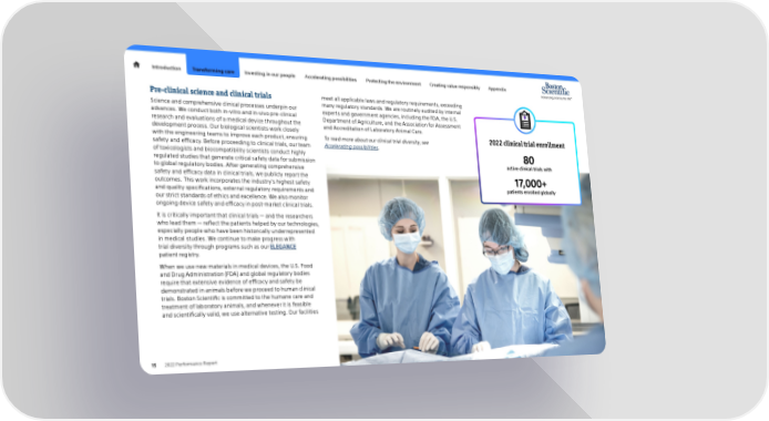 Introduction Transforming care Investing in our people Accelerating possibilities Protecting the environment Creating value responsibly Appendix Pre-clinical science and clinical trials meet all applicable laws and regulatory requirements, exceeding Science and comprehensive clinical processes underpin our many regulatory standards. We are routinely audited by internal advances. We conduct both in-vitro and in-vivo pre-clinical experts and government agencies, including the FDA, the U.S. research and evaluations of a medical device throughout the Department of Agriculture, and the Association for Assessment development process. Our biological scientists work closely and Accreditation of Laboratory Animal Care. with the engineering teams to improve each product, ensuring To read more about our clinical trial diversity, see 2022 clinical trial enrollment safety and efficacy. Before proceeding to clinical trials, our team Accelerating possibilities. of toxicologists and biocompatibility scientists conduct highly 80 regulated studies that generate critical safety data for submission active clinical trials with to global regulatory bodies. After generating comprehensive safety and efficacy data in clinical trials, we publicly report the 17,000+ outcomes. This work incorporates the industry's highest safety and quality specifications, external regulatory requirements and patients enrolled globally our strict standards of ethics and excellence. We also monitor ongoing device safety and efficacy in post-market clinical trials. It is critically important that clinical trials — and the researchers who lead them — reflect the patients helped by our technologies, especially people who have been historically underrepresented in medical studies. We continue to make progress with trial diversity through programs such as our ELEGANCE patient registry. When we use new materials in medical devices, the U.S. Food and Drug Administration (FDA) and global regulatory bodies require that extensive evidence of efficacy and safety be demonstrated in animals before we proceed to human clinical trials. Boston Scientific is committed to the humane care and treatment of laboratory animals, and whenever it is feasible and scientifically valid, we use alternative testing. Our facilities 15 2022 Performance Report
