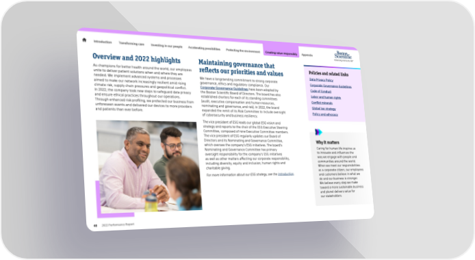 Introduction Transforming care Investing in our people Accelerating possibilities Protecting the environment Creating value responsibly Appendix Overview and 2022 highlights Maintaining governance that Policies and related links As champions for better health around the world, our employees reflects our priorities and values unite to deliver patient solutions when and where they are Data Privacy Policy needed. We implement advanced systems and processes We have a longstanding commitment to strong corporate Corporate Governance Guidelines aimed to make our network increasingly resilient amid rising governance, ethics and regulatory compliance. Our climate risk, supply chain pressures and geopolitical conflict. Corporate Governance Guidelines have been adopted by Code of Conduct In 2022, the company took new steps to safeguard data privacy the Boston Scientific Board of Directors. The board has also Labor and human rights and ensure ethical practices throughout our operations. established charters for each of its standing committees Conflict minerals Through enhanced risk profiling, we protected our business from (audit, executive compensation and human resources, unforeseen events and delivered our devices to more providers nominating and governance, and risk). In 2022, the board Global tax strategy and patients than ever before. expanded the remit of its Risk Committee to include oversight Policy and advocacy of cybersecurity and business resiliency. The vice president of ESG leads our global ESG vision and strategy and reports to the chair of the ESG Executive Steering Committee, composed of nine Executive Committee members. The vice president of ESG regularly updates our Board of Directors and its Nominating and Governance Committee, Why it matters which oversee the company’s ESG initiatives. The board's Nominating and Governance Committee has primary Caring for human life inspires us oversight responsibility for the company’s ESG initiatives to innovate and influences the as well as other matters affecting our corporate responsibility, way we engage with people and including diversity, equity and inclusion, human rights and communities around the world. charitable giving. When we meet our responsibilities as a corporate citizen, our employees For more information about our ESG strategy, see the Introduction. and customers believe in what we do and our business is stronger. We believe every step we make toward a more sustainable business and planet delivers value for our stakeholders. 48 2022 Performance Report