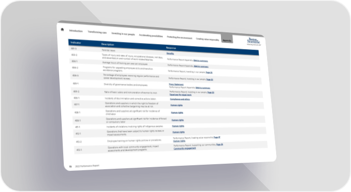 Introduction Transforming care Investing in our people Accelerating possibilities Protecting the environment Creating value responsibly Appendix Indicator Description Response 401-3 Parental leave Benefits 403-2 Types of injury and rates of injury, occupational diseases, lost days, Performance Report Appendix, Metrics summary and absenteeism and number of work-related fatalities 404-1 Average hours of training per year per employee Performance Report Appendix, Metrics summary 404-2 Programs for upgrading employee skills and transition Performance Report, Investing in our people, Page 20 assistance programs 404-3 Percentage of employees receiving regular performance and Performance Report, Investing in our people, Page 20 career development reviews 405-1 Diversity of governance bodies and employees Proxy Statement Performance Report Appendix, Metrics summary 405-2 Ratio of basic salary and remuneration of women to men Performance Report, Investing in our people, Page 20 Equal pay for equal work 406-1 Incidents of discrimination and corrective actions taken Compliance and ethics 407-1 Operations and suppliers in which the right to freedom of Human rights association and collective bargaining may be at risk 408-1 Operations and suppliers at significant risk for incidence of Human rights child labor 409-1 Operations and suppliers at significant risk for incidence of forced Human rights or compulsory labor 411-1 Incidents of violations involving rights of Indigenous peoples Human rights 412-1 Operations that have been subject to human rights reviews or Human rights impact assessments 412-2 Employee training on human rights policies or procedures Performance Report, Creating value responsibly, Page 47 Human rights 413-1 Operations with local community engagement, impact Performance Report, Supporting our communities, Page 36 assessments and development programs Community engagement 73 2022 Performance Report