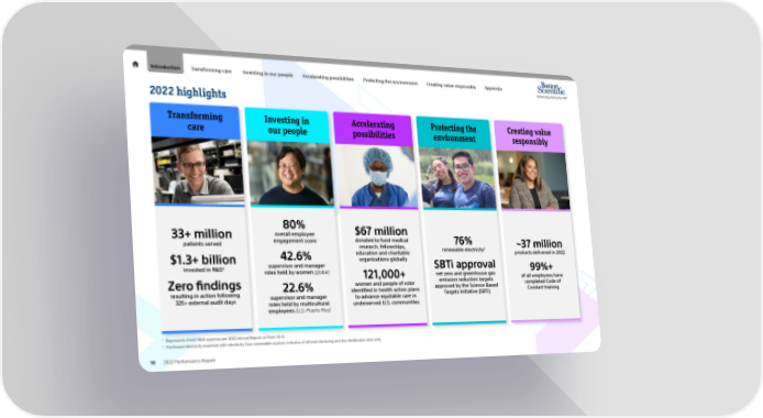 Introduction Transforming care Investing in our people Accelerating possibilities Protecting the environment Creating value responsibly Appendix 2022 highlights Transforming Investing in Accelerating Protecting the Creating value care our people possibilities environment responsibly 80% $67 million 33+ million overall employee patients served engagement score donated to fund medical 76% ~37 million research, fellowships, renewable electricity2 42.6% education and charitable products delivered in 2022 $1.3+ billion organizations globally 1 supervisor and manager SBTi approval invested in R&D roles held by women (global) 99%+ 121,000+ net-zero and greenhouse gas of all employees have Zero findings women and people of color emission reduction targets completed Code of 22.6% identified in health action plans approved by the Science Based Conduct training resulting in action following supervisor and manager to advance equitable care in Targets initiative (SBTi) 325+ external audit days roles held by multicultural underserved U.S. communities employees (U.S./Puerto Rico) 1 Represents GAAP R&D expense per 2022 Annual Report on Form 10-K. 2 Purchased electricity matched with electricity from renewable sources, inclusive of all manufacturing and key distribution sites only. 10 2022 Performance Report