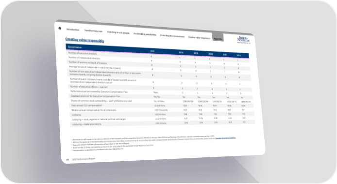 Introduction Transforming care Investing in our people Accelerating possibilities Protecting the environment Creating value responsibly Appendix Creating value responsibly Governance Unit 2018 2019 2020 2021 2022 Number of executive directors # 1 1 1 1 1 1 Number of independent directors # 9 9 9 9 9 1 Number of women on Board of Directors # 3 3 3 3 3 1 Average tenure of independent board members (years) # 5 6 7 7 8 Number of non-executive/independent directors who sit on four or less public 1 company boards, including Boston Scientific # 9 9 8 9 9 Number of public company boards outside of Boston Scientific on which # 3 3 3 3 3 2 non-executive/independent directors can sit 3 Number of executive officers — women # 3 3 4 3 1 Performance period covered by Executive Compensation Plan Years 3 3 3 3 3 Clawback provision for Executive Compensation Plan Yes/No Yes Yes Yes Yes Yes 4 Shares of common stock outstanding — each entitled to one vote No. of Votes 1,385,961,926 1,396,195,349 1,417,165,707 1,426,724,712 1,434,780,104 5 Total annual CEO compensation USD millions 13.97 15.76 13.77 16.06 16.94 Median annual compensation for all employees USD thousands 62.5 65.6 59.3 68.9 76.1 Lobbying USD millions 1.68 1.68 1.52 1.52 1.52 Lobbying — local, regional or national political campaigns USD millions 0.27 0.26 0.25 0.22 0.18 Lobbying — trade associations USD millions 0.14 0.14 0.13 0.21 0.11 1 Donna James will remain in her role as a director of the Company until her resignation becomes effective on the day of the 2023 Annual Meeting of Stockholders, which is scheduled to occur on May 4, 2023. 2 Without the approval of the Nominating and Governance Committee, no director may sit on more than four public company boards (including the Company’s board). For more information, please review our Corporate Governance Guidelines. 3 Executive officers: includes all executive officers listed in the Annual Report. 4 Total number of shares outstanding as listed on the cover page of the applicable Annual Report on Form 10-K. 5 Compensation is calculated in accordance with Item 402 of Reg S-K. 67 2022 Performance Report