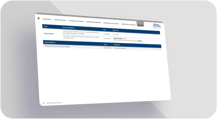 Introduction Transforming care Investing in our people Accelerating possibilities Protecting the environment Creating value responsibly Appendix Topic Accounting Metric Code Response Total amount of monetary losses as a result of legal proceedings HC-MS-510a.1 $0 in 2022 associated with bribery or corruption Business Ethics Description of code of ethics governing interactions with health HC-MS-510a.2 Code of Conduct, Page 32 care professionals Performance Report, Creating value responsibly, Page 47 Activity Metrics Code Response Number of units sold by product category HC-MS-000.A Not currently disclosed 77 2022 Performance Report