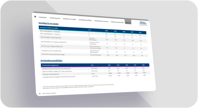 Introduction Transforming care Investing in our people Accelerating possibilities Protecting the environment Creating value responsibly Appendix Investing in our people Employee health and safety Unit 2018 2019 2020 2021 2022 Work related fatalities — employees # 0.0 0.0 0.0 0.0 0.0 Work related fatalities — contractors # 0.0 0.0 0.0 0.0 0.0 Total Recordable Incident Rate (TRIR) Injuries per 0.52 0.53 0.47 0.42 0.28 100 employees Total Recordable Injury Frequency Rate (TRIFR) Injuries per 1 million 2.6 2.7 2.3 2.1 1.4 hours worked Lost Time Injury Frequency Rate (LTIFR) Lost Time Injuries per 2.6 3.0 1.7 1.3 0.7 1 million hours worked Occupational Lost Time Rate (OLTR) Lost Time Days per 5.2 5.9 4.7 4.5 3.0 100 employees TRIR, TRIFR, LTIFR and OLTR rate coverage Percent of employees 66.0 66.0 67.0 98.0 100 Accelerating possibilities Community engagement Unit 2018 2019 2020 2021 2022 1 Monetary value of philanthropic cash contributions USD millions 8.90 8.14 9.04 7.21 6.72 Boston Scientific Foundation (U.S.) cash contributions USD millions 1.07 1.19 1.21 1.21 2.09 Employee volunteering hours Hours 43,000 41,000 23,000 51,000 31,444 2 2 2 Overhead costs for management of philanthropic activities USD millions 0.068 0.067 0.200 0.222 0.286 1 This includes donations to Health Care Providers (HCP) and non-HCP charitable organizations and does not include any medical grant, research grant or fellowship funding. 2 Data includes community engagement, sales charitable contributions committee costs and foundation consultant fees. 63 2022 Performance Report