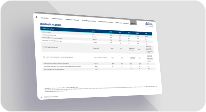 Introduction Transforming care Investing in our people Accelerating possibilities Protecting the environment Creating value responsibly Appendix Investing in our people Career and culture Unit 2018 2019 2020 2021 2022 Total new hires FTE 7,298 8,417 6,494 8,303 10,370 Employee retention rate Percent 88.1 88.0 89.7 84.7 84.9 Employee turnover or attrition rate Percent 11.9 12.0 10.3 15.3 15.1 Employee voluntary turnover rate Percent 9.5 9.5 7.1 11.4 12.3 Analysis not Analysis not completed. 1 Pay equity global (gender) Global BSC 99%+ 99%+ completed 99%+ Next Analysis will take place in 2023. Analysis not Analysis not completed. 1 Pay equity multicultural (U.S., including Puerto Rico) U.S., including Puerto Rico 99%+ 99%+ completed 99%+ Next Analysis will take place in 2023. Open positions filled by internal candidates Percent 20.1 17.5 20.5 22.0 19.2 2 2 2 Period that long-term incentives for employees are paid out after Years 4 4 4 4 4 3 Average learning hours/employee Hours - - 16.5 18.6 19.5 1 We will be completing every other year. Next analysis scheduled for 2023. 2 Vesting for options and restricted units is four years (25% per year). Boston Scientific changed from 5-year to 4-year award vesting beginning with RSUs granted in FY 2019. Half of the value delivered to executives is through performance share units, which have a three year cliff vest. 3 Inclusive of global indirect labor employees only. 62 2022 Performance Report