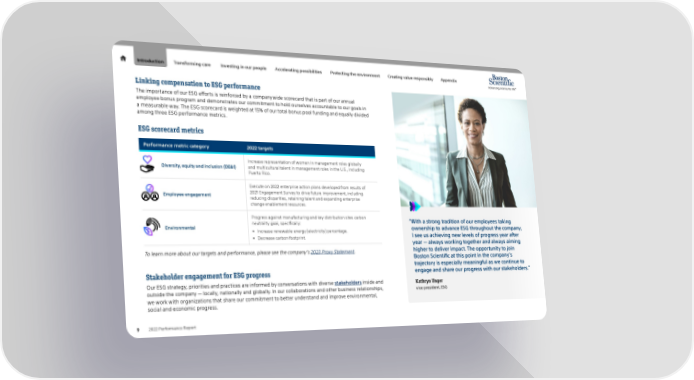 Introduction Transforming care Investing in our people Accelerating possibilities Protecting the environment Creating value responsibly Appendix Linking compensation to ESG performance The importance of our ESG efforts is reinforced by a companywide scorecard that is part of our annual employee bonus program and demonstrates our commitment to hold ourselves accountable to our goals in a measurable way. The ESG scorecard is weighted at 15% of our total bonus pool funding and equally divided among three ESG performance metrics. ESG scorecard metrics Performance metric category 2022 targets Increase representation of women in management roles globally Diversity, equity and inclusion (DE&I) and multicultural talent in management roles in the U.S., including Puerto Rico. Execute on 2022 enterprise action plans developed from results of Employee engagement 2021 Engagement Survey to drive future improvement, including reducing disparities, retaining talent and expanding enterprise change enablement resources. Progress against manufacturing and key distribution sites carbon “ With a strong tradition of our employees taking neutrality goal, specifically: Environmental • Increase renewable energy (electricity) percentage. ownership to advance ESG throughout the company, • Decrease carbon footprint. I see us achieving new levels of progress year after year — always working together and always aiming To learn more about our targets and performance, please see the company’s 2023 Proxy Statement. higher to deliver impact. The opportunity to join Boston Scientific at this point in the company’s trajectory is especially meaningful as we continue to Stakeholder engagement for ESG progress engage and share our progress with our stakeholders.” Our ESG strategy, priorities and practices are informed by conversations with diverse stakeholders inside and Kathryn Unger outside the company — locally, nationally and globally. In our collaborations and other business relationships, vice president, ESG we work with organizations that share our commitment to better understand and improve environmental, social and economic progress. 9 2022 Performance Report
