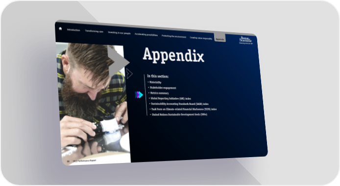 Introduction Transforming care Investing in our people Accelerating possibilities Protecting the environment Creating value responsibly Appendix Appendix In this section: • Materiality • Stakeholder engagement • Metrics summary • Global Reporting Initiative (GRI) index • Sustainability Accounting Standards Board (SASB) index • Task Force on Climate-related Financial Disclosures (TCFD) index • United Nations Sustainable Development Goals (SDGs) 56 2022 Performance Report