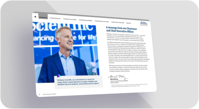 Introduction Transforming care Investing in our people Accelerating possibilities Protecting the environment Creating value responsibly Appendix A message from our Chairman and Chief Executive Officer At Boston Scientific, our purpose is advancing science for life — a purpose shared by our more than 45,000 employees around the world. This commitment is a result of a values-driven culture that aims to create a brighter and healthier future for patients, communities and our planet. Our 2022 environmental, social and governance results demonstrate high performance across our company. Our global teams navigated supply chain disruption, expanded our digital and operational capabilities, and fueled our pipeline by investing more than 10% of our sales into research 1 and development. We took action to address inequities in the workplace, communities and health care systems. Because a healthier planet leads to healthier people, we made steady progress toward our 2030 commitment 2 for carbon neutrality and received approval of our science-based emission reduction targets that will help guide our path to net-zero greenhouse gas emissions across our entire value chain by 2050. Most importantly, we worked together to help improve the lives of more than 33 million patients around the world. We have much more to do and will always raise the bar to hold ourselves accountable for progress. I know the culture we have built will continue to serve us well as we work together to transform lives around the world through innovative medical solutions. " At Boston Scientific, our commitment is a result of a Mike Mahoney values-driven culture that aims to create a brighter and Chairman and Chief Executive Officer, healthier future for patients, communities and our planet." Boston Scientific 1 Represents GAAP R&D expense as a percent of GAAP net sales per 2022 Annual Report on Form 10-K. 2 Inclusive of all manufacturing and key distribution sites only (scopes 1 and 2). 5 2022 Performance Report