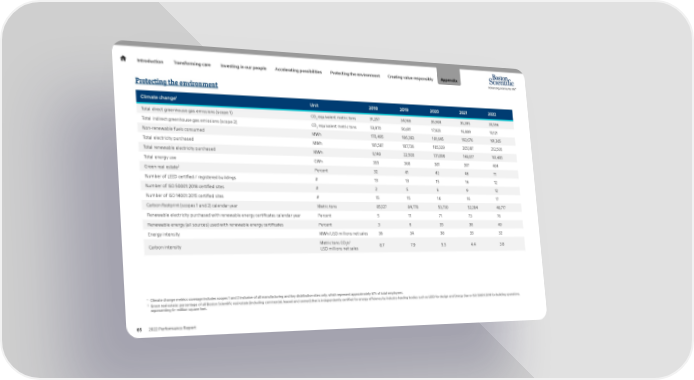 Introduction Transforming care Investing in our people Accelerating possibilities Protecting the environment Creating value responsibly Appendix Protecting the environment Climate change1 Unit 2018 2019 2020 2021 2022 Total direct greenhouse gas emissions (scope 1) CO equivalent metric tons 31,257 34,168 35,908 35,395 35,596 2 Total indirect greenhouse gas emissions (scope 2) CO equivalent metric tons 53,870 50,611 17,823 16,889 13,121 2 Non-renewable fuels consumed MWh 170,495 186,393 191,645 192,076 191,365 Total electricity purchased MWh 181,587 187,736 185,329 205,187 212,505 Total renewable electricity purchased MWh 9,149 22,508 131,896 149,617 161,485 Total energy use GWh 355 368 381 397 404 2 Green real estate Percent 32 41 42 46 71 Number of LEED certified / registered buildings # 13 13 15 16 12 Number of ISO 50001:2018 certified sites # 2 5 6 9 12 Number of ISO 14001:2015 certified sites # 15 15 16 16 17 Carbon footprint (scopes 1 and 2) calendar year Metric tons 85,127 84,778 53,730 52,284 48,717 Renewable electricity purchased with renewable energy certificates calendar year Percent 5 11 71 73 76 Renewable energy (all sources) used with renewable energy certificates Percent 3 6 35 38 40 Energy intensity MWh/USD millions net sales 36 34 38 33 32 Metric tons CO e/ Carbon intensity 2 8.7 7.9 5.5 4.4 3.8 USD millions net sales 1 Climate change metrics coverage includes scopes 1 and 2 inclusive of all manufacturing and key distribution sites only, which represent approximately 67% of total employees. 2 Green real estate: percentage of all Boston Scientific real estate (including commercial, leased and owned) that is independently certified for energy efficiency by industry-leading bodies such as LEED for design and Energy Star or ISO 50001:2018 for building operations, representing 6+ million square feet. 65 2022 Performance Report