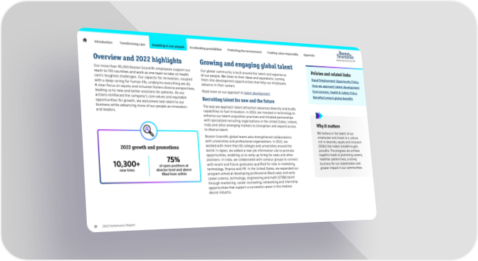 Introduction Transforming care Investing in our people Accelerating possibilities Protecting the environment Creating value responsibly Appendix Overview and 2022 highlights Growing and engaging global talent Our more than 45,000 Boston Scientific employees support our Our global community is built around the talent and experience Policies and related links reach to 130 countries and work as one team to take on health of our people. We listen to their ideas and aspirations, turning Equal Employment Opportunity Policy care’s toughest challenges. Our capacity for innovation, coupled them into development opportunities that help our employees How we approach talent development with a deep caring for human life, underpins everything we do. advance in their careers. Environment, Health & Safety Policy A clear focus on equity and inclusion fosters diverse perspectives, Read more on our approach to talent development. leading us to new and better solutions for patients. As our BenefitsConnect global benefits actions reinforced the company’s core values and equitable Recruiting talent for now and the future opportunities for growth, we welcomed new talent to our business while advancing more of our people as innovators The way we approach talent attraction advances diversity and builds and leaders. capabilities to fuel innovation. In 2022, we invested in technology to enhance our talent acquisition practices and initiated partnerships with specialized recruiting organizations in the United States, Ireland, Why it matters India and other emerging markets to strengthen and expand access to diverse talent. We believe in the talent of our Boston Scientific global teams also strengthened collaborations employees and invest in a culture with universities and professional organizations. In 2022, we rich in diversity, equity and inclusion 2022 growth and promotions worked with more than 80 colleges and universities around the (DE&I) that makes breakthroughs world. In Japan, we added a new job information site to promote possible. The progress we achieve opportunities, enabling us to ramp up hiring for sales and other together leads to promising careers, 75% positions. In India, we collaborated with campus groups to connect healthier patient lives, a strong 10,300+ of open positions at with recent and future graduates qualified for roles in marketing, business for our stakeholders and new hires director level and above technology, finance and HR. In the United States, we expanded our greater impact in our communities. filled from within program aimed at developing professional Black sales and early- career science, technology, engineering and math (STEM) talent through mentoring, career counseling, networking and internship opportunities that support a successful career in the medical device industry. 21 2022 Performance Report