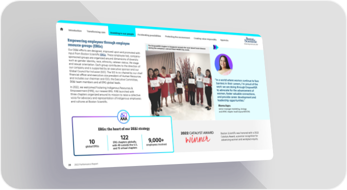 Introduction Transforming care Investing in our people Accelerating possibilities Protecting the environment Creating value responsibly Appendix Empowering employees through employee The EmpowHER chapter in Singapore spreads the word about heart disease resource groups (ERGs) during the company's annual Heart Health Day event. Our DE&I efforts are designed, improved upon and promoted with input from Boston Scientific ERGs. These employee-led, company- sponsored groups are organized around dimensions of diversity such as gender identity, race, ethnicity, veteran status, life stage and sexual orientation. Each group contributes to the direction of our company and is supported by an executive sponsor and our Global Council for Inclusion (GCI). The GCI is co-chaired by our chief financial officer and executive vice president of Human Resources ā In a world where women continue to face and includes our chairman and CEO, the Executive Committee, barriers in their careers, Iām proud of the DE&I team members and all ERG global leads. work we are doing through EmpowHER In 2022, we welcomed Fostering Indigenous Resources & to advocate for the advancement of Empowerment (FIRE), our newest ERG. FIRE launched with women, foster valuable connections, three chapters organized around its mission to raise a collective and provide career development and voice for advocacy and representation of Indigenous employees leadership opportunities.ā and cultures at Boston Scientific. Bhavna Sapra senior manager marketing, Urology and APAC chapter lead EmpowHER ERG ERGs: the heart of our DE&I strategy 122 Boston Scientific was honored with a 2022 10 9,000+ Catalyst Award, a premier recognition for ERG chapters globally, advancing women and workplace equity. global ERGs with 49 outside the U.S. employees involved and 15 virtual chapters 28 2022 Performance Report