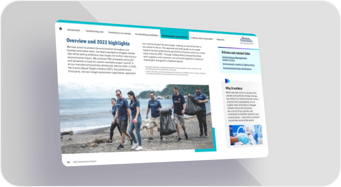 Introduction Transforming care Investing in our people Accelerating possibilities Protecting the environment Creating value responsibly Appendix Overview and 2022 highlights our science-based net-zero target, making us one of the first in our sector to do so. This approval will help guide us on a path Policies and related links We took action to protect the environment throughout our toward net-zero greenhouse gas (GHG) emissions across our entire business and value chain. Our teams worked to mitigate climate value chain by 2050. Through collaborations and partnerships Global Energy Management risks while setting ambitious new targets for further reducing our with suppliers and customers, we will work together to advance System Policy environmental impact. We achieved 76% renewable electricity1 meaningful change for a healthier planet. Environment, Health & Safety Policy 2 and remained on track for carbon neutrality (scope 1 and 2) in Environmental Data Verification all our manufacturing and key distribution sites by 2030. In 2022, 1 Purchased electricity matched with electricity from renewable sources, inclusive of all the Science Based Targets initiative (SBTi), the predominant manufacturing and key distribution sites only. 2 Scope 1 emissions are direct emissions from owned or controlled sources. Scope 2 emissions third-party, net-zero target assessment organization, approved are indirect emissions from the generation of purchased energy. Why it matters When we take action to protect the planet and confront climate change, we reduce our environmental impact, improve the sustainability of our supply chain and help to mitigate climate risks to the business. As a result of our activity, we contribute to healthier patients and communities — and more successful economies around the world. 39 2022 Performance Report