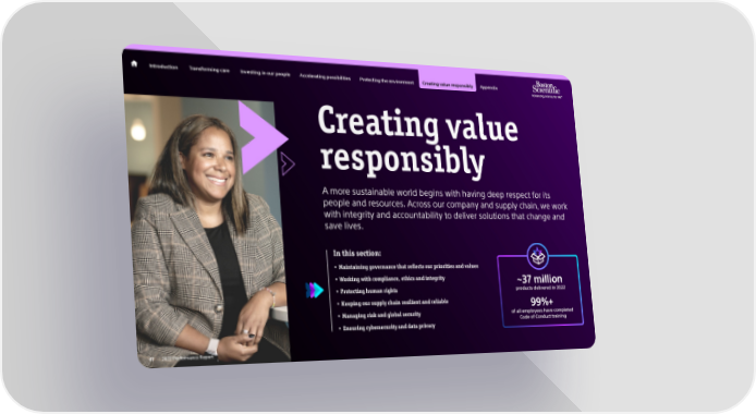 Introduction Transforming care Investing in our people Accelerating possibilities Protecting the environment Creating value responsibly Appendix Creating value responsibly A more sustainable world begins with having deep respect for its people and resources. Across our company and supply chain, we work with integrity and accountability to deliver solutions that change and save lives. In this section: • Maintaining governance that reflects our priorities and values • Working with compliance, ethics and integrity ~37 million • Protecting human rights products delivered in 2022 • Keeping our supply chain resilient and reliable 99%+ • Managing risk and global security of all employees have completed Code of Conduct training • Ensuring cybersecurity and data privacy 47 2022 Performance Report