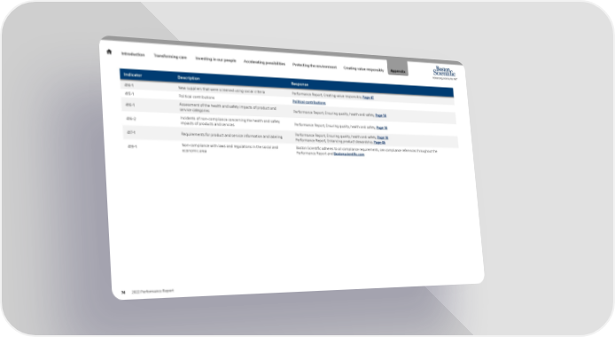 Introduction Transforming care Investing in our people Accelerating possibilities Protecting the environment Creating value responsibly Appendix Indicator Description Response 414-1 New suppliers that were screened using social criteria Performance Report, Creating value responsibly, Page 47 415-1 Political contributions Political contributions 416-1 Assessment of the health and safety impacts of product and Performance Report, Ensuring quality, health and safety, Page 18 service categories 416-2 Incidents of non-compliance concerning the health and safety Performance Report, Ensuring quality, health and safety, Page 18 impacts of products and services 417-1 Requirements for product and service information and labeling Performance Report, Ensuring quality, health and safety, Page 18 Performance Report, Enhancing product stewardship, Page 46 419-1 Non-compliance with laws and regulations in the social and Boston Scientific adheres to all compliance requirements, see compliance references throughout the economic area Performance Report and Bostonscientific.com 74 2022 Performance Report