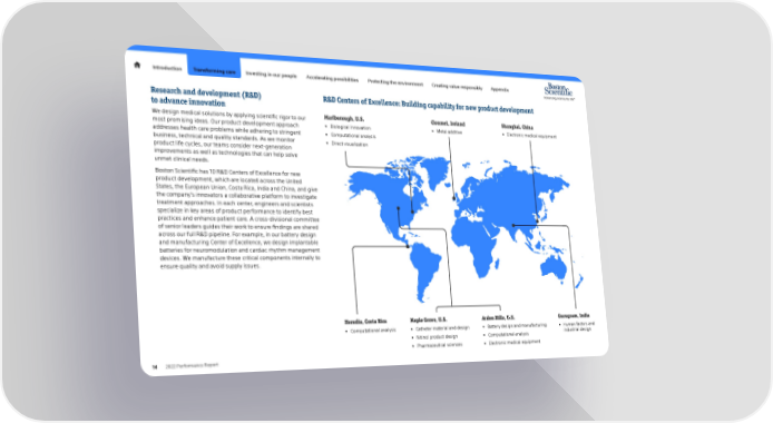 Introduction Transforming care Investing in our people Accelerating possibilities Protecting the environment Creating value responsibly Appendix Research and development (R&D) R&D Centers of Excellence: Building capability for new product development to advance innovation We design medical solutions by applying scientific rigor to our Marlborough, U.S. Clonmel, Ireland Shanghai, China most promising ideas. Our product development approach • Biological innovation • Metal additive • Electronic medical equipment addresses health care problems while adhering to stringent • Computational analysis business, technical and quality standards. As we monitor • Direct visualization product life cycles, our teams consider next-generation improvements as well as technologies that can help solve unmet clinical needs. Boston Scientific has 10 R&D Centers of Excellence for new product development, which are located across the United States, the European Union, Costa Rica, India and China, and give the company’s innovators a collaborative platform to investigate treatment approaches. In each center, engineers and scientists specialize in key areas of product performance to identify best practices and enhance patient care. A cross-divisional committee of senior leaders guides their work to ensure findings are shared across our full R&D pipeline. For example, in our battery design and manufacturing Center of Excellence, we design implantable batteries for neuromodulation and cardiac rhythm management devices. We manufacture these critical components internally to ensure quality and avoid supply issues. Heredia, Costa Rica Maple Grove, U.S. Arden Hills, U.S. Gurugram, India • Computational analysis • Catheter material and design • Battery design and manufacturing • Human factors and • Nitinol product design • Computational analysis industrial design • Pharmaceutical sciences • Electronic medical equipment 14 2022 Performance Report