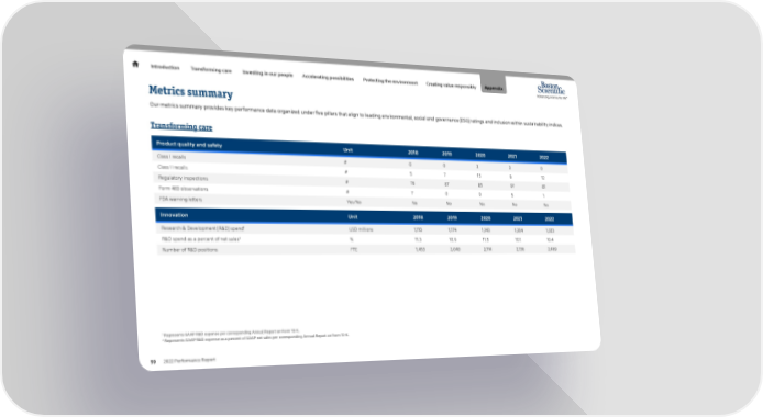 Introduction Transforming care Investing in our people Accelerating possibilities Protecting the environment Creating value responsibly Appendix Metrics summary Our metrics summary provides key performance data organized under five pillars that align to leading environmental, social and governance (ESG) ratings and inclusion within sustainability indices. Transforming care Product quality and safety Unit 2018 2019 2020 2021 2022 Class I recalls # 0 0 3 3 0 Class II recalls # 5 7 15 8 12 Regulatory inspections # 76 87 85 97 81 Form 483 observations # 7 0 0 5 1 FDA warning letters Yes/No No No No No No Innovation Unit 2018 2019 2020 2021 2022 1 Research & Development (R&D) spend USD millions 1,113 1,174 1,143 1,204 1,323 2 R&D spend as a percent of net sales % 11.3 10.9 11.5 10.1 10.4 Number of R&D positions FTE 1,453 2,040 2,114 2,136 2,469 1 Represents GAAP R&D expense per corresponding Annual Report on Form 10-K. 2 Represents GAAP R&D expense as a percent of GAAP net sales per corresponding Annual Report on Form 10-K. 59 2022 Performance Report