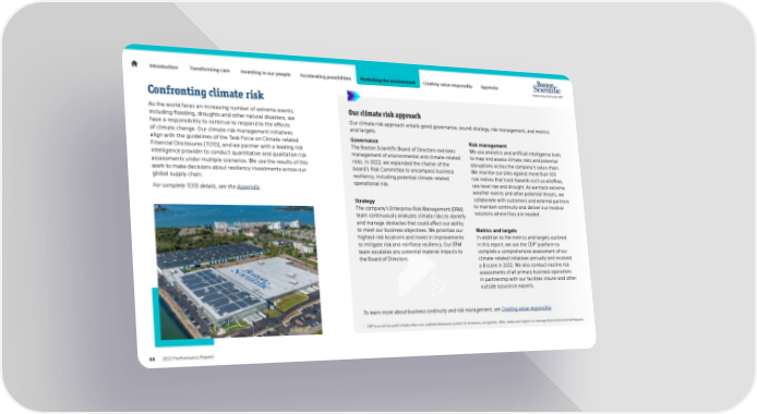 Introduction Transforming care Investing in our people Accelerating possibilities Protecting the environment Creating value responsibly Appendix Confronting climate risk As the world faces an increasing number of extreme events, Our climate risk approach including flooding, droughts and other natural disasters, we Our climate risk approach entails good governance, sound strategy, risk management, and metrics have a responsibility to continue to respond to the effects and targets. of climate change. Our climate risk management initiatives align with the guidelines of the Task Force on Climate-related Governance Risk management Financial Disclosures (TCFD), and we partner with a leading risk The Boston Scientific Board of Directors oversees We use analytics and artificial intelligence tools intelligence provider to conduct quantitative and qualitative risk management of environmental and climate-related to map and assess climate risks and potential assessments under multiple scenarios. We use the results of this risks. In 2022, we expanded the charter of the disruptions across the company's value chain. work to make decisions about resiliency investments across our board’s Risk Committee to encompass business We monitor our sites against more than 100 global supply chain. resiliency, including potential climate-related risk indices that track hazards such as wildfires, operational risk. sea-level rise and drought. As we track extreme For complete TCFD details, see the Appendix. weather events and other potential threats, we Strategy collaborate with customers and external partners The company’s Enterprise Risk Management (ERM) to maintain continuity and deliver our medical team continuously analyzes climate risks to identify solutions where they are needed. and manage obstacles that could affect our ability to meet our business objectives. We prioritize our Metrics and targets highest-risk locations and invest in improvements In addition to the metrics and targets outlined to mitigate risk and reinforce resiliency. Our ERM in this report, we use the CDP1 platform to team escalates any potential material impacts to complete a comprehensive assessment of our the Board of Directors. climate-related initiatives annually and received a B score in 2022. We also conduct routine risk assessments of all primary business operations in partnership with our facilities insurer and other outside assurance experts. To learn more about business continuity and risk management, see Creating value responsibly. 1 CDP is a not-for-profit charity that runs a global disclosure system for investors, companies, cities, states and regions to manage their environmental impacts. 44 2022 Performance Report
