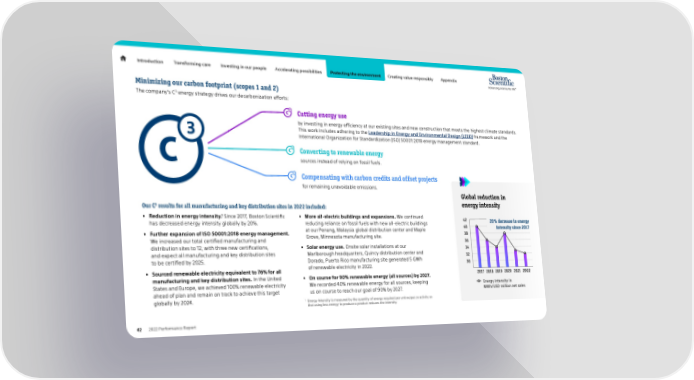 Introduction Transforming care Investing in our people Accelerating possibilities Protecting the environment Creating value responsibly Appendix Minimizing our carbon footprint (scopes 1 and 2) The company’s C3 energy strategy drives our decarbonization efforts: Cutting energy use by investing in energy efficiency at our existing sites and new construction that meets the highest climate standards. This work includes adhering to the Leadership in Energy and Environmental Design (LEED) framework and the International Organization for Standardization (ISO) 50001:2018 energy management standard. Converting to renewable energy sources instead of relying on fossil fuels. Compensating with carbon credits and offset projects for remaining unavoidable emissions. Global reduction in 3 energy intensity Our C results for all manufacturing and key distribution sites in 2022 included: 1 • Reduction in energy intensity. Since 2017, Boston Scientific • More all-electric buildings and expansions. We continued 42 20% decrease in energy has decreased energy intensity globally by 20%. reducing reliance on fossil fuels with new all-electric buildings 40 intensity since 2017 • Further expansion of ISO 50001:2018 energy management. at our Penang, Malaysia global distribution center and Maple 38 We increased our total certified manufacturing and Grove, Minnesota manufacturing site. 36 distribution sites to 12, with three new certifications, • Solar energy use. Onsite solar installations at our 34 and expect all manufacturing and key distribution sites Marlborough headquarters, Quincy distribution center and 32 to be certified by 2025. Dorado, Puerto Rico manufacturing site generated 5 GWh 30 • Sourced renewable electricity equivalent to 76% for all of renewable electricity in 2022. manufacturing and key distribution sites. In the United • On course for 90% renewable energy (all sources) by 2027. 2017 2018 2019 2020 2021 2022 States and Europe, we achieved 100% renewable electricity We recorded 40% renewable energy for all sources, keeping Energy intensity in ahead of plan and remain on track to achieve this target us on course to reach our goal of 90% by 2027. MWh/USD million net sales globally by 2024. 1 Energy Intensity is measured by the quantity of energy required per unit output or activity so that using less energy to produce a product reduces the intensity. 42 2022 Performance Report