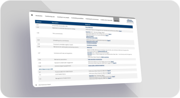 Introduction Transforming care Investing in our people Accelerating possibilities Protecting the environment Creating value responsibly Appendix Indicator Description Response 2-21 Annual total compensation ratio Proxy Statement 2-22 Statement on sustainable development strategy Performance Report, A message from our Chairman and Chief Executive Officer, Page 5 Form 10-K, Item 1. Business Strategy, Page 3 Performance Report, Our ESG strategy and priorities, Page 8 2-23 Policy commitments Performance Report, Our mission and values, Page 6 Code of Conduct Respecting human rights Performance Report, Creating value responsibly, Page 47 2-24 Embedding policy commitments Respecting human rights Compliance and ethics 2-25 Processes to remediate negative impacts Compliance and ethics 2-26 Mechanisms for seeking advice and raising concerns Advice line Boston Scientific adheres to all compliance requirements, see compliance references throughout the Performance Report and Bostonscientific.com 2-27 Compliance with laws and regulations Form 10-K, Item 1. Regulatory Environment, Page 9 Form 10-K, Item 8. Financial Statements and Supplementary Data, Note I - Commitments and Contingencies, Page 103 Performance Report Appendix, Metrics summary 2-28 Membership associations Trade association memberships 2-29 Approach to stakeholder engagement Performance Report, Our ESG strategy and priorities, Page 8 Performance Report Appendix, Stakeholder engagement, Page 58 2-30 Collective bargaining agreements Human rights, collective bargaining GRI 3: Material topics 2021 3-1 Process to determine material topics Performance Report Appendix, Materiality, Page 57 3-2 List of material topics Performance Report Appendix, Materiality, Page 57 Form 10-K, Item 1. Business, Page 3 3-3 Management of material topics Performance Report, Our ESG strategy and priorities, Page 8 Performance Report Appendix, Materiality, Page 57 70 2022 Performance Report