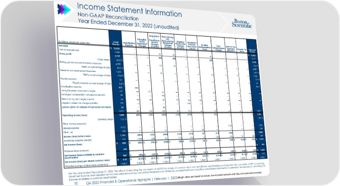 Income Statement Information Non-GAAP Reconciliation Year Ended December 31, 2022 (unaudited) Acquisition Restructuring / and Intangible Divestitures- Restructuring Litigation- Investment Asset Related -Related Net Related Net Portfolio EU MDR Debt Deferred Tax GAAP Amortization Impairment Charges Charges Charges Net Losses Implementation Extinguishment Expenses Discrete Tax Adjusted* In millions, except per share data Results Expense Charges (Credits) (Credits) (Credits) (Gains) Costs Charges (Benefits) Items Results Net sales $ 12,682 — — — — — — — — — — $ 12,682 Cost of products sold 3,956 — — 97 65 — — 46 — — — 3,747 Gross profit 8,727 — — (97) (65) — — (46) — — — 8,935 Gross margin 68.8 % 70.5 % Selling, general and administrative expenses 4,520 — — 110 21 — — 2 — — — 4,387 SG&A as a percentage of sales 35.6 % 34.6 % Research and development expenses 1,323 — — 40 — — — 24 — — — 1,260 R&D as a percentage of sales 10.4 % 9.9 % Royalty expense 47 — — — — — — — — — — 47 Royalty expense as a percentage of sales 0.4 % 0.4 % Amortization expense 803 803 — — — — — — — — — — Intangible asset impairment charges 132 — 132 — — — — — — — — — Contingent consideration net expense (benefit) 35 — — 35 — — — — — — — — Restructuring net charges (credits) 24 — — — 24 — — — — — — — Litigation-related net charges (credits) 173 — — — — 173 — — — — — — Losses (gains) on disposal of businesses and assets 22 — — 22 — — — — — — — — 7,078 803 132 206 45 173 — 25 — — — 5,694 Operating Income (loss) 1,649 (803) (132) (303) (110) (173) — (71) — — — 3,241 Operating margin 13.0 % 25.6 % Other income (expense): Interest expense (470) — — — — — — — (194) — — (276) Other, net (38) — — 18 — — 30 — — — — (86) Income (loss) before taxes 1,141 (803) (132) (285) (110) (173) 30 (71) (194) — — 2,880 Income tax expense (benefit) 443 (109) (29) 53 (14) (40) 2 (10) (45) 140 129 366 Net Income (loss) $ 698 $ (694) $ (102) $ (338) $ (96) $ (133) $ 28 $ (62) $ (149) $ (140) $ (129) $ 2,514 Preferred stock dividends (55) $ (55) Net Income (loss) available to common stockholders 642 $ (694) $ (102) $ (338) $ (96) $ (133) $ 28 $ (62) $ (149) $ (140) $ (129) $ 2,459 Net Income (loss) per diluted common share $ 0.45 $ (0.48) $ (0.07) $ (0.24) $ (0.07) $ (0.09) $ 0.02 $ (0.04) $ (0.10) $ (0.10) $ (0.09) $ 1.71 Weighted average diluted shares outstanding 1,439.7 1,439.7 1,439.7 1,439.7 1,439.7 1,439.7 1,439.7 1,439.7 1,439.7 1,439.7 1,439.7 1,439.7 For the year ended December 31, 2022, the effect of assuming the conversion of MCPS into shares of common stock was anti-dilutive, and therefore excluded from the calculation of EPS. Accordingly, GAAP net income and adjusted net income were reduced by cumulative Preferred stock dividends, as presented in our unaudited consolidated statements of operations, for purposes of calculating net income available to common stockholders. 10 Margin rates are based on actual, non-rounded amounts and may not recalculate precisely. Q4 2022 Financial & Operational Highlights | February 1, 2023
