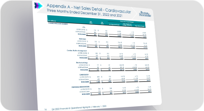 Appendix A - Net Sales Detail - Cardiovascular Three Months Ended December 31, 2022 and 2021 Year-over-Year Change Q4 Q4 Less: Impact of (in millions) 2022 2021 As Reported Basis Foreign Currency Operational Basis CARDIOVASCULAR SEGMENT: ICTx UNITED STATES $ 176 $ 185 (5.3) % — % (5.3) % INTERNATIONAL 386 390 (1.1) % (11.3) % 10.2 % WORLDWIDE $ 561 $ 575 (2.4) % (7.6) % 5.2 % Watchman UNITED STATES $ 253 $ 205 23.6 % — % 23.6 % INTERNATIONAL 27 28 (2.9) % (12.1) % 9.2 % WORLDWIDE $ 280 $ 233 20.5 % (1.4) % 21.9 % Cardiac Rhythm Management UNITED STATES $ 332 $ 312 6.4 % — % 6.4 % INTERNATIONAL 189 202 (6.6) % (11.5) % 4.9 % WORLDWIDE $ 521 $ 514 1.3 % (4.5) % 5.8 % Electrophysiology UNITED STATES $ 79 $ 32 143.4 % — % 143.4 % INTERNATIONAL 88 68 30.1 % (14.5) % 44.5 % WORLDWIDE $ 167 $ 100 66.7 % (9.8) % 76.4 % CARDIOLOGY UNITED STATES $ 840 $ 735 14.3 % — % 14.3 % INTERNATIONAL 690 687 0.3 % (11.7) % 12.0 % WORLDWIDE $ 1,529 $ 1,422 7.5 % (5.6) % 13.2 % PERIPHERAL INTERVENTIONS UNITED STATES $ 266 $ 248 7.5 % — % 7.5 % INTERNATIONAL 210 214 (2.1) % (12.4) % 10.3 % WORLDWIDE $ 476 $ 462 3.0 % (5.8) % 8.8 % 16 Q4 2022 Financial & Operational Highlights | February 1, 2023