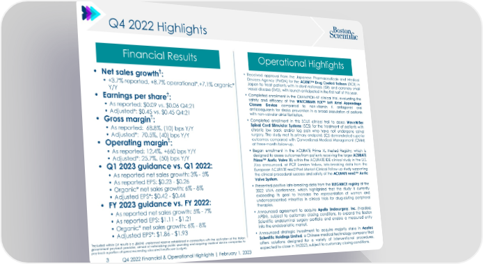 Q4 2022 Highlights Operational Highlights Financial Results • Received approval from the Japanese Pharmaceuticals and Medical † • Net sales growth : Devices Agency (PMDA) for the AGENT™ Drug Coated Balloon (DCB) in Japan to treat patients with in-stent restenosis (ISR) and coronary small • +3.7% reported, +8.7% operational*,+7.1% organic* vessel disease (SVD), with launch anticipated in the first half of this year. Y/Y • Completed enrollment in the CHAMPION-AF clinical trial, evaluating the † safety and efficacy of the WATCHMAN FLX™ Left Atrial Appendage • Earnings per share : Closure Device compared to non-vitamin K antagonist oral • As reported: $0.09 vs. $0.06 Q4:21 anticoagulants for stroke prevention in a broad population of patients with non-valvular atrial fibrillation. • Adjusted*: $0.45 vs. $0.45 Q4:21 † • Completed enrollment in this SOLIS clinical trail to assess WaveWriter • Gross margin : Spinal Cord Stimulator Systems (SCS) for the treatment of patients with • As reported: 68.8%, (10) bps Y/Y chronic low back and/or leg pain who have not undergone spinal surgery. The study met its primary endpoint; SCS demonstrated superior • Adjusted*: 70.5%, (40) bps Y/Y outcomes compared with Conventional Medical Management (CMM) † at three-month follow-up. • Operating margin : • Began enrollment in the ACURATE Prime XL Nested Registry, which is • As reported: 12.4%, +660 bps Y/Y designed to assess outcomes from patients receiving the larger ACURATE • Adjusted*: 25.7%, (50) bps Y/Y Prime™ Aortic Valve XL within the ACURATE IDE clinical study in the U.S. Also announced, at PCR London Valves, late-breaking data from the • Q1 2023 guidance vs. Q1 2022: European ACURATE neo2 Post Market Clinical Follow-up study supporting • As reported net sales growth: 3% - 5% the clinical procedural success and safety of the ACURATE neo2™ Aortic Valve System. • As reported EPS: $0.23 - $0.26 • Presented positive late-breaking data from the ELEGANCE registry at the • Organic* net sales growth: 6% - 8% 2022 VIVA conference, which highlighted that the study is currently • Adjusted EPS*: $0.42 - $0.44 exceeding its goal to increase the representation of women and underrepresented minorities in clinical trials for drug-eluting peripheral • FY 2023 guidance vs. FY 2022: therapies. • As reported net sales growth: 5% - 7% • Announced agreement to acquire Apollo Endosurgery, Inc. (Nasdaq: • As reported EPS: $1.11 - $1.21 APEN), subject to customary closing conditions, to expand the Boston Scientific endoluminal surgery portfolio and enable a measured entry • Organic* net sales growth: 6% - 8% into the endobariatric market. • Adjusted EPS*: $1.86 - $1.93 • Announced strategic investment to acquire majority stake in Acotec † Included within Q4 results is a ($60M) unplanned reserve established in connection with the activation of the Italian Scientific Holdings Limited, a Chinese medical technology company that government payback provision, aimed at rationalizing public spending and requiring medical device companies to offers solutions designed for a variety of interventional procedures, pay back a portion of spend exceeding allocated healthcare budgets expected to close in 1H:2023, subject to customary closing conditions. 3 Q4 2022 Financial & Operational Highlights | February 1, 2023