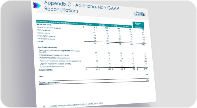 Appendix C - Additional Non-GAAP Reconciliations 12 Months Ended Reconciliation of Debt to Adjusted EBITDA (in millions) Q1 2022 Q2 2022 Q3 2022 Q4 2022 12/31/2022 Net income (loss) $ 110 $ 260 $ 188 $ 140 $ 698 Income tax (benefit) expense 45 85 57 256 443 Interest expense 279 64 63 64 470 Interest income (4) (1) (1) (4) (10) Depreciation expense 76 80 82 94 333 Amortization expense 198 204 202 199 803 EBITDA 705 692 590 750 2,737 Non-GAAP Adjustments Restructuring and restructuring-related net charges (credits) 29 35 18 28 110 Intangible asset impairment charges — 7 125 — 132 Investment portfolio net losses (gains) 7 4 (3) (38) (30) Acquisition/divestiture - related net charges (credits) 72 91 113 9 285 Litigation-related net charges (credits) — 42 — 131 173 EU MDR implementation costs 16 17 20 19 71 Adjusted EBITDA $ 829 $ 887 $ 862 $ 900 $ 3,478 Debt $ 8,935 Debt to Adjusted EBITDA 2.57x 24 Q4 2022 Financial & Operational Highlights | February 1, 2023