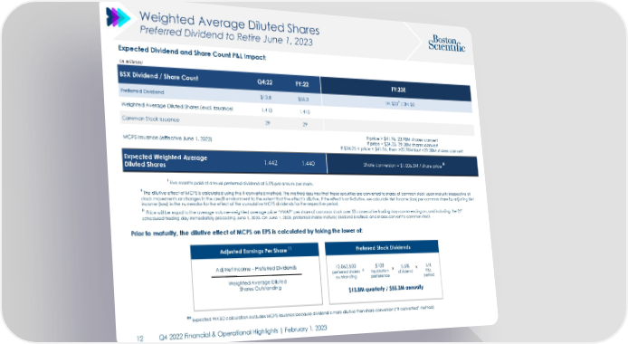 Weighted Average Diluted Shares Preferred Dividend to Retire June 1, 2023 Expected Dividend and Share Count P&L Impact: (in millions) BSX Dividend / Share Count Q4:22 FY:22 FY:23E ƚ Preferred Dividend $13.8 $55.3 1H: $23 / 2H: $0 Weighted Average Diluted Shares (excl. issuance) 1,413 1,410 Common Stock Issuance 29 29 Q2 2022 Highlights If price > $41.96, 23.98M shares convert MCPS Issuance (effective June 1, 2023) If price < $34.25, 29.38M shares convert If $34.25 < price < $41.96, then >23.98M but <29.38M shares convert Expected Weighted Average ƚƚƚ 1,442 1,440 Share conversion = $1,006.3M / share price Diluted Shares ƚ Five months paid of annual preferred dividend at 5.5% per annum per share. ƚƚ The dilutive effect of MCPS is calculated using the if-converted method. The method assumes that these securities are converted to shares of common stock upon maturity irrespective of stock movements or changes in the credit environment to the extent that the effect is dilutive. If the effect is anti-dilutive, we calculate Net income (loss) per common share by adjusting Net income (loss) in the numerator for the effect of the cumulative MCPS dividends for the respective period. ƚƚƚ st Price will be equal to the average volume-weighted average price “VWAP” per share of common stock over 20 consecutive trading days commencing on, and including, the 21 scheduled trading day immediately preceding June 1, 2023. On June 1, 2023, preferred shares mature; dividend is retired, and shares convert to common stock Prior to maturity, the dilutive effect of MCPS on EPS is calculated by taking the lower of: ƚƚƚƚ Adjusted Earnings Per Share Preferred Stock Dividends Adj Net Income – Preferred Dividends 10,062,500 $100 1/4 5.5% x x x preferred shares liquidation P&L dividend outstanding preference period Weighted Average Diluted Shares Outstanding $13.8M quarterly / $55.3M annually ƗƗƗƗ Expected WASO calculation excludes MCPS issuance because dividend is more dilutive than share conversion (“if-converted” method) 12 Q4 2022 Financial & Operational Highlights | February 1, 2023