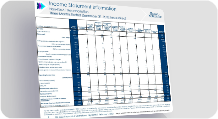 Income Statement Information Non-GAAP Reconciliation Three Months Ended December 31, 2022 (unaudited) Acquisition Restructuring / and Intangible Divestitures- Restructuring Litigation- Investment Asset Related -Related Net Related Net Portfolio EU MDR Debt Deferred Tax GAAP Amortization Impairment Charges Charges Charges Net Losses Implementation Extinguishment Expenses Discrete Tax Adjusted* In millions, except per share data Results Expense Charges (Credits) (Credits) (Credits) (Gains) Costs Charges (Benefits) Items Results Net sales $ 3,242 $ — $ — $ — $ — $ — $ — $ — $ — $ — $ — $ 3,242 Cost of products sold 1,011 — — 24 16 — — 13 — — — 957 Gross profit 2,231 — — (24) (16) — — (13) — — — 2,285 Gross margin 68.8 % 70.5 % Selling, general and administrative expenses 1,163 — — 29 6 — — 0 — — — 1,127 SG&A as a percentage of sales 35.9 % 34.8 % Research and development expenses 330 — — 12 — — — 6 — — — 312 R&D as a percentage of sales 10.2 % 9.6 % Royalty expense 13 — — — — — — — — — — 13 Royalty expense as a percentage of sales 0.4 % 0.4 % Amortization expense 199 199 — — — — — — — — — — Intangible asset impairment charges — — — — — — — — — — — — Contingent consideration net expense (benefit) (33) — — (33) — — — — — — — — Restructuring net charges (credits) 6 — — — 6 — — — — — — — Litigation-related net charges (credits) 131 — — — — 131 — — — — — — Losses (gains) on disposal of businesses and assets 22 — — 22 — — — — — — — — 1,830 199 — 29 12 131 — 6 — — — 1,452 Operating Income (loss) 402 (199) — (53) (28) (131) — (19) — — — 833 Operating margin 12.4 % 25.7 % Other income (expense): Interest expense (64) — — — — — — — — — — (64) Other, net 58 — — 44 — — 38 — — — — (23) Income (loss) before taxes 396 (199) — (9) (28) (131) 38 (19) — — — 745 Income tax expense (benefit) 256 (24) (1) 50 (3) (30) 6 (2) 0 42 129 89 Net Income (loss) 140 (175) 1 (59) (25) (101) 32 (17) (0) (42) (129) 656 Preferred stock dividends (14) (14) Net Income (loss) available to common stockholders $ 126 $ (175) $ 1 $ (59) $ (25) $ (101) $ 32 $ (17) $ (0) $ (42) $ (129) $ 642 Net Income (loss) per diluted common share $ 0.09 $ (0.12) $ — $ (0.04) $ (0.02) $ (0.07) $ 0.02 $ (0.01) $ (0.00) $ (0.03) $ (0.09) $ 0.45 Weighted average diluted shares outstanding 1,442.4 1,442.4 1,442.4 1,442.4 1,442.4 1,442.4 1,442.4 1,442.4 1,442.4 1,442.4 1,442.4 1,442.4 For the three months ended December 31, 2022, the effect of assuming the conversion of Mandatory Convertible Preferred Stock (MCPS) into shares of common stock was anti-dilutive, and therefore excluded from the calculation of EPS. Accordingly, GAAP net income and adjusted net income were reduced by cumulative Preferred stock dividends, as presented in our unaudited consolidated statements of operations, for purposes of calculating net income available to common stockholders. 9 Margin rates are based on actual, non-rounded amounts and may not recalculate precisely. Q4 2022 Financial & Operational Highlights | February 1, 2023